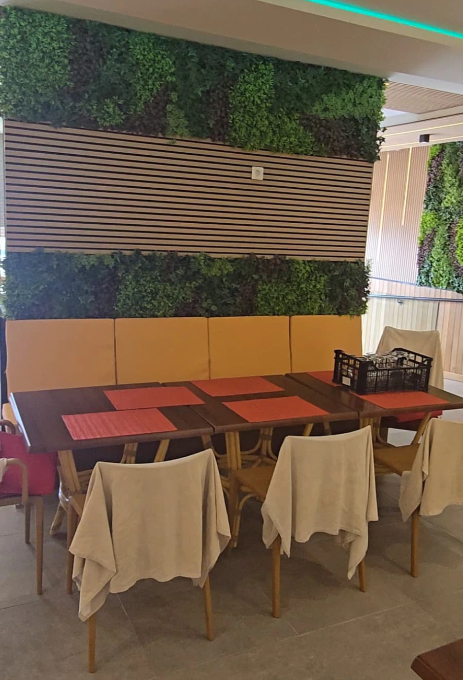Un elemento clave en la estética del restaurante fue la colocación de listones de madera decorativos: